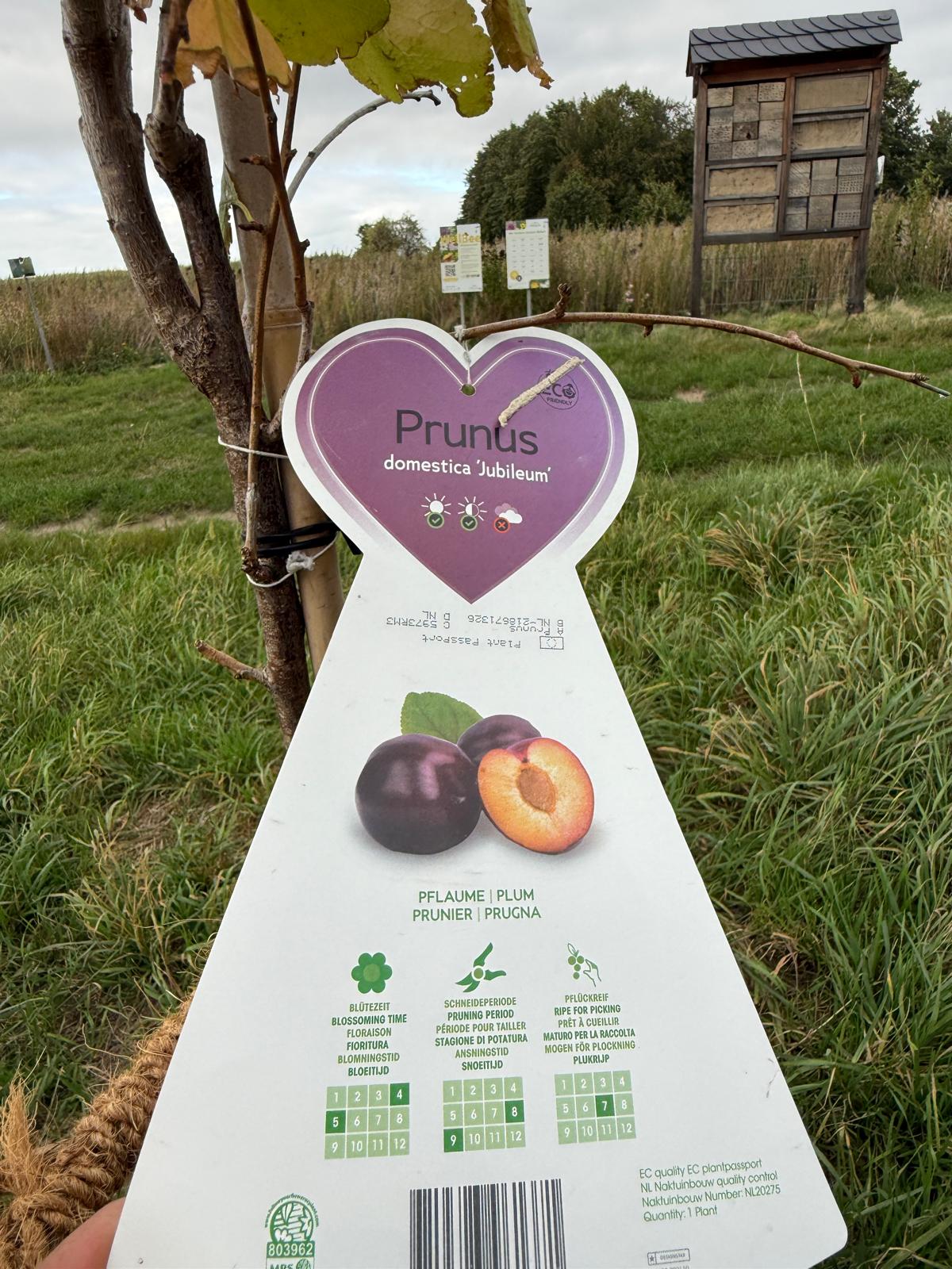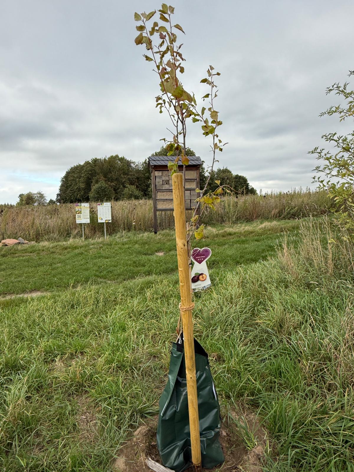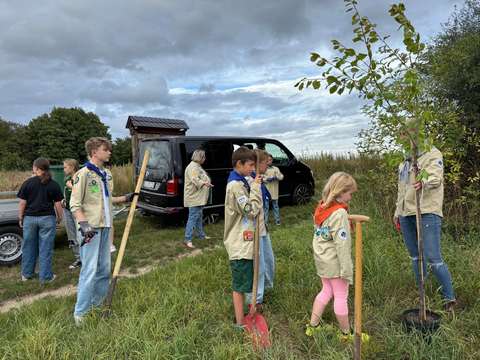 Nach Absprache wurde entschieden, dass eine frühe Pflaumensorte auf dem Gelände gepflanzt wird. Der Standort wurde sorgfältig ausgewählt – der Baum wurde gegenüber dem Bienenhotel aufgestellt. Damit tragen die Pfadfinder aktiv zur Förderung der Biodiversität und zur Verschönerung der Bienenweide bei.
