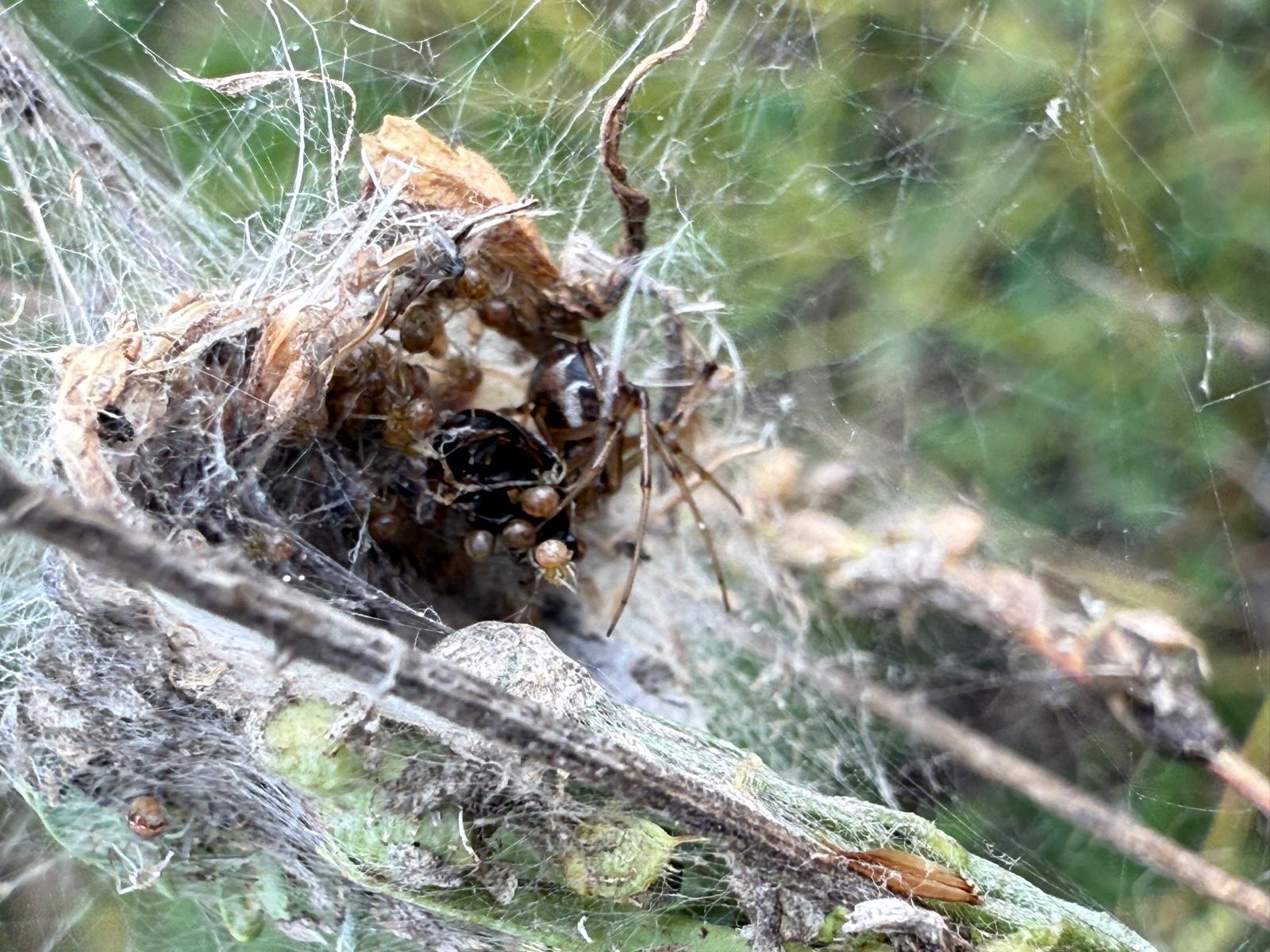 Während der Paarungszeit im Frühjahr und Herbst hält sich das Männchen regelmäßig in unmittelbarer Nähe zum Netz des Weibchens auf und teilt häufig über einen längeren Zeitraum den Schlupfwinkel mit diesem. Die Eiablage findet ebenfalls in diesem geschützten Bereich statt. Die Kokons werden dort befestigt und vom Weibchen sorgfältig bewacht, um einen effektiven Schutz der Nachkommen sicherzustellen.